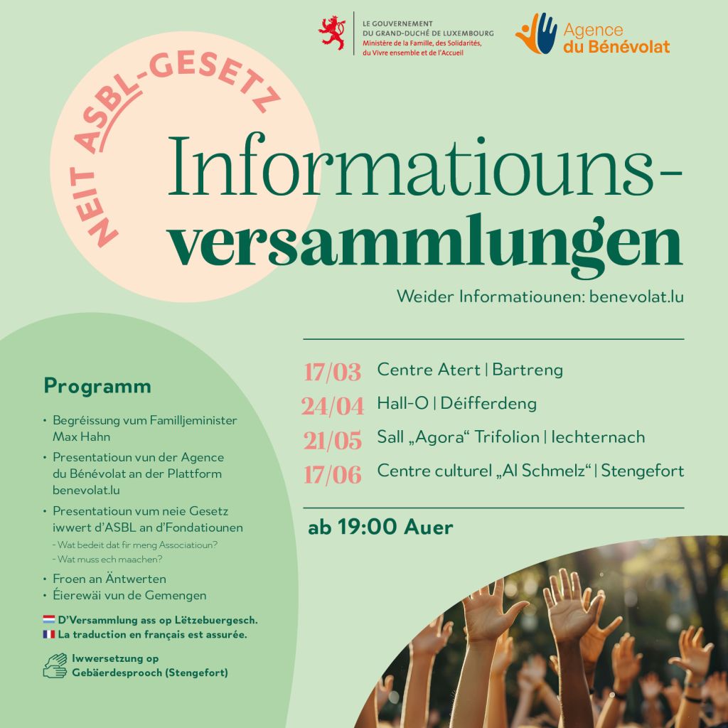 3. Wann Dir nach Froen zum neien ASBL-Gesetz hutt oder Dir onsécher doriwwer sidd, wéi Dir Är Statute konform dem neie Gesetz upasse kënnt, da kommt laanscht op eng vun de 4 Informatiounsversammlungen zum neien ASBL-Gesetz, organiséiert vum Familljeministère an der Agence du Bénévolat a Presenz vum Familljeminister Max Hahn: